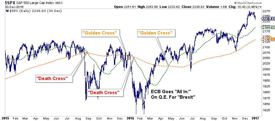 Over the next couple of weeks, you are going to see a LOT of commentary about “the Golden Cross” buy signal and why this means the “bull market” is officially back in action. While “golden crosses” are indeed bullish for the markets, they are not an infallible signal. The chart below shows the 2015-2016 market where investors were whipsawed over a 6-month period before massive central bank interventions got the markets back on track.